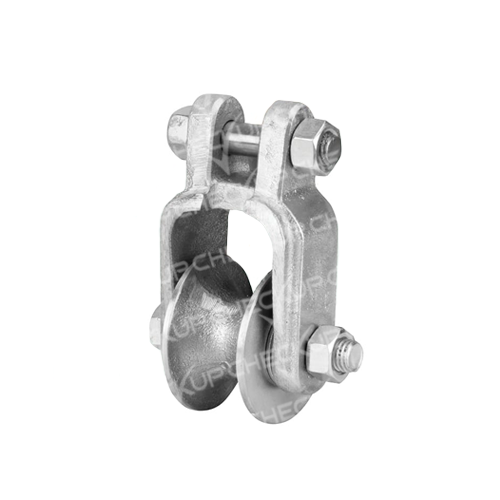 Para lançamento do cabo mensageiro em ângulo ou tangente em estruturas tipo “C”. Instalada no braço “C” nas furações dos isoladores de pino, serve de suporte para o cabo mensageiro durante o seu lançamento, não deixando que ele se solte. Lateral e roldana construídas em alumínio, parafusos e porcas em aço com tratamento anticorrosivo.