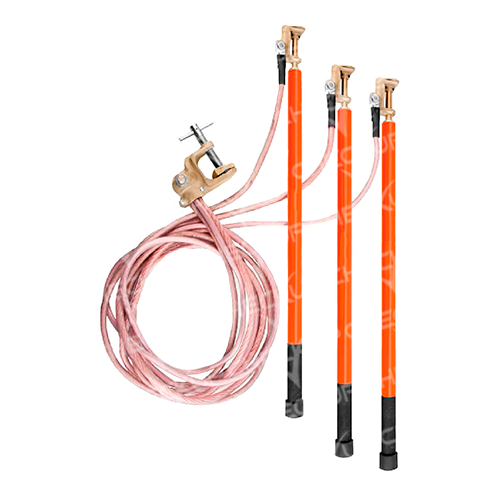 Conjunto de Aterramento Rápido e Temporário para Cubículo (Cabine Primária) até 13,8KV. Atende os requisitos das normas NBR 6881, NBR 8762, NBR 11854 e NR 10. Bastões com 25mmx600mm com grampo em bronze. 03 Lances de 3 metros de cabo de cobre 25mm. Grampo para fixação em bronze.